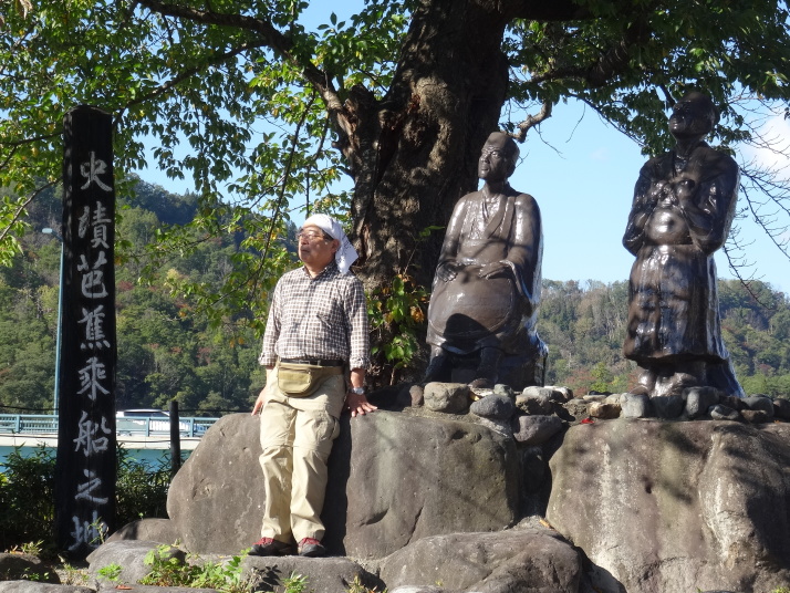 舟形駅で休憩、更に歩を進めて鳥越の一里塚を越え国道47号線(鶴岡街道)に合流した所に運よく食堂があったので昼食をとりました。右前方に鳥海山を眺めながら歩いていき、2時過ぎに芭蕉が最上川舟下りで乗船した本合海に到着しました。芭蕉広場があり、芭蕉と曽良の像や『五月雨をあつめて早し最上川』の句碑があります。ここで暫く休憩して、まだ時間があったので明日の最上川舟下りの乗船地古口まで歩くことにしました。 ところが、ここからの鶴岡街道は歩道無しでトラックの往来も多く厳しい歩きになりました。トラックのすれ違い時は脇に寄りたいのに最上川沿いなのでガードレールが直ぐそこ、ギリギリまで体を外に寄せ、固くして行き過ぎるのを待つしかありません。これを繰り返しながら7qほど歩き、漸く古口に到着です。 |
