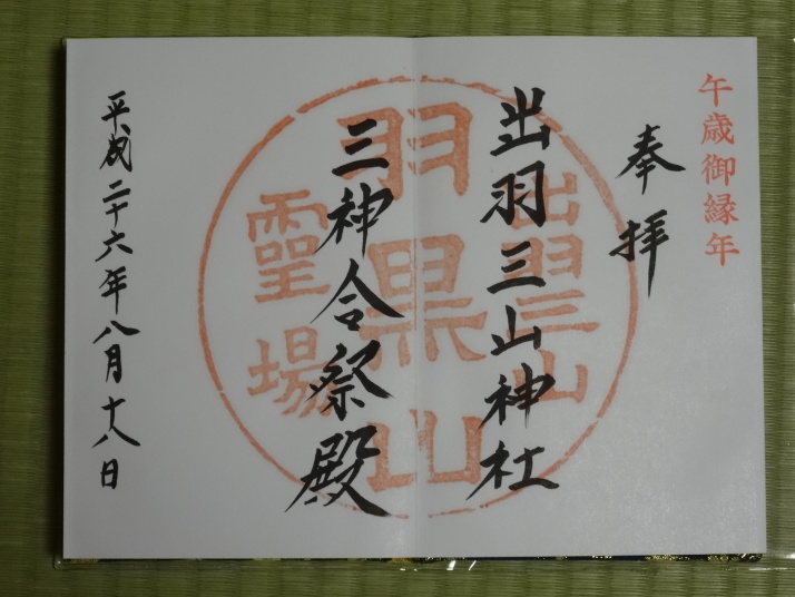 8時に休暇村を車で出発、8時40分月山七合目(合清水)から歩き始めました。曽良日記によると芭蕉も七合目(旧高清水)まで馬を利用しているのでそれに倣いました。30分ほどで八合目の弥陀ヶ原に到着、ここから岩がごろごろする登山道を登り、10時半に九合目の仏生池を通過、11時45分に山頂に着きました。九合目を過ぎると濃いガスが発生したり、強風や雨が降ったりと天候の変化の中を歩き難い道を進むことになりました。 山頂で月山神社を参拝、登拝認定証とご朱印をもらいました。出羽三山のご朱印は全て両開きの大型のご朱印で、伊勢神宮と同じ様に神社間で統一性があります。登頂後は今日の宿、銀山温泉に向かいました。 |
