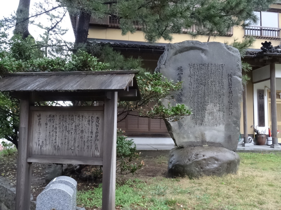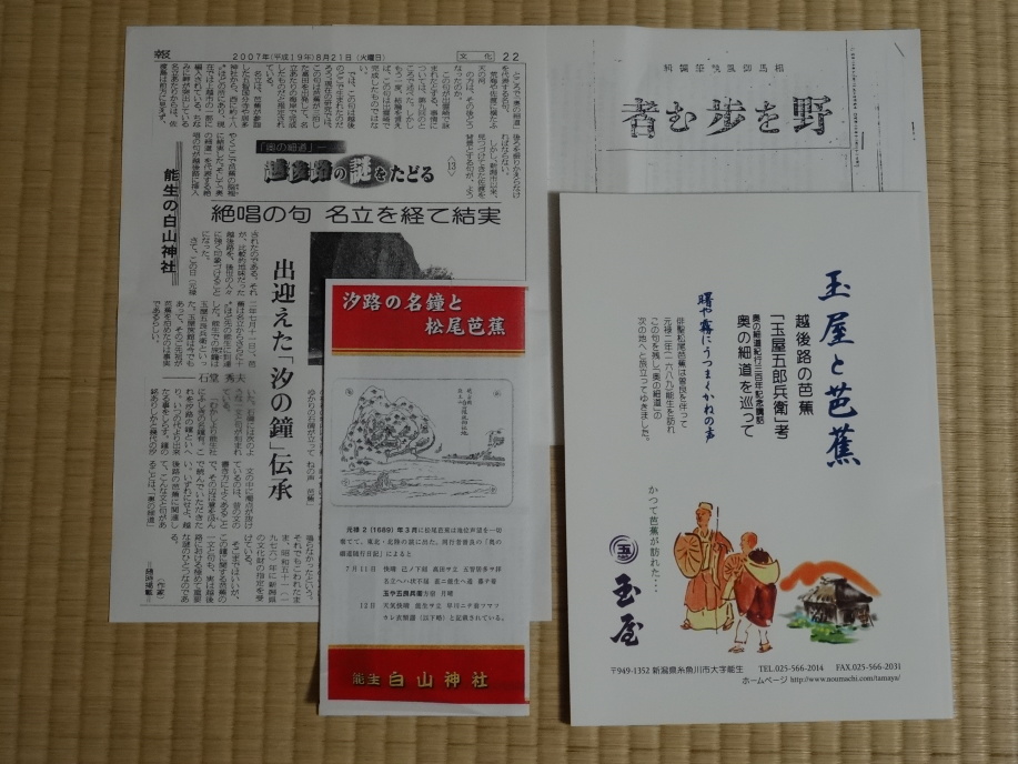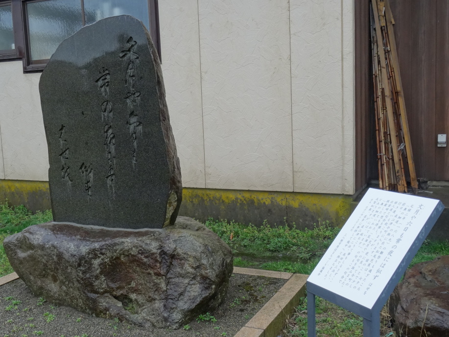一日中雨の中の歩きでした。先ず、昨日飲み屋の主人に聞いた芭蕉の宿泊地へ。旧マルセンデパートの建物はそのままで雑居ビルになっていました。その近くに聴信寺があります。芭蕉は当初この聴信寺に泊まる予定で紹介状を持って行ったが、葬儀の最中なので出てきてしまった。寺からは再三泊まるように迎えの者を寄こしたが、芭蕉は戻る気を失くし、結局古川市左衛門宅に泊まった。あわや柏崎の二の舞・・・。 海沿いの琴平神社に芭蕉句碑「文月や六日も常の夜には似ず」がありました。更に歩を進めると、船見公園に小川見明「赤いローソクと人魚」に因んで建てられた人魚のブロンズ像が海を見ていました。立派な五智国分寺に「薬欄にいづれの花をくさ枕」の句碑があります。更に居多神社を参って親鸞上人の上陸地に行き暫し休憩。今日は天気も悪く海は荒れ模様です。 郷津から久比岐自転車歩行者道に入ります。旧北陸本線の線路跡地を利用した国道8号線に沿って走る自転車・歩行者専用道路で糸魚川の中宿まで32q、安心して歩くことが出来ます。直ぐに「能鷹」の田中酒造がありますが、酒造りは終わっていて閑散としていました。時折トンネルを潜りながら先を進みます。8号線はトラックが水しぶきを上げながら走っていますがここは安心。名立で遅い昼食をとり、更に進んで17時に国重文の能生白山神社に到着、茅葺屋根の趣のある拝殿です。境内には「汐路の鐘」にまつわる芭蕉の句碑「曙や霧にうつまく鐘の聲」もありました。 今日の宿は芭蕉も泊まった旅館玉屋。「・・暮テ着。玉や五良兵衛方に宿」(曾良日記) |
