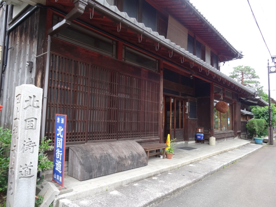 敦賀・田保邸を8時前に出発。おくのほそ道には「露通も此みなとまで出迎ひて、美濃の国へと伴ふ。駒に助けられて大垣の庄に入れば、・・」と書かれているだけで、芭蕉が敦賀からどのルートをとったかは不明、私は塩津海道を行くことにしました。(曾良がいれば詳細な記録を残していたはずですが。) 塩津海道に入り、ダラダラ坂を1時間歩いて西村屋孫兵衛茶屋に到着しました。福井と滋賀の県境にあるこの西村家には「おくのほそ道」の素龍清書本が伝わっています。国重文で昨年来た時は原本を見せてもらい当主から説明もして頂きましたが、今回は丁度昼時だったので写で我慢しました。近江塩津駅で小休止、塩津宿を経て14時過ぎに漸く琵琶湖が見えてきました。琵琶湖の北岸に沿って歩き、賤ヶ岳の脇を通って木之本に到着。 木之本は木之本地蔵院の門前町であり、北國街道の重要な宿場として栄えただけに今でも宿場の雰囲気を色濃く残しています。2軒の酒蔵があり、山路酒造は日本で5番目に古い酒蔵、冨田酒造も10番以内に入る古さ。更に冨田酒造の店内には北大路魯山人の書いた「七本槍」の扁額がかかっています。これは魯山人が冨田家に投宿(居候?)していた時に書いたもの。これで「奥の細道 八十八か所酒蔵巡り」も目出度く結願、最後を飾るに相応しい酒蔵でした。 |