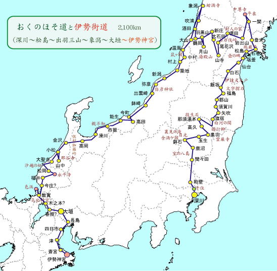 「おくのほそ道」を歩きます。 「おくのほそ道」は歌枕や西行の旅路を辿った紀行文学、元禄2年3月27日に江戸深川を出発して8月21日に大垣に到着するまで600里といわれる行程でした。更に9月6日には大垣を出発して伊勢神宮に向かっています。丁度、式年遷宮の年で僧侶の風体の芭蕉は遠くから伊勢神宮を参拝したとあります。そこで、私の「奥の細道」は伊勢神宮を終点とし、深川から伊勢神宮まで約2,100qを6〜7回に分けて歩くことにしました。 芭蕉の歩いた道を想定しながら五万分の一の地図にルートを書き込み、曾良に倣って名勝備忘録を作成し、深川・採茶庵から芭蕉の辿った道を進みます。 |