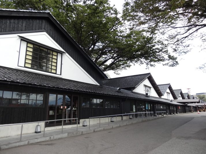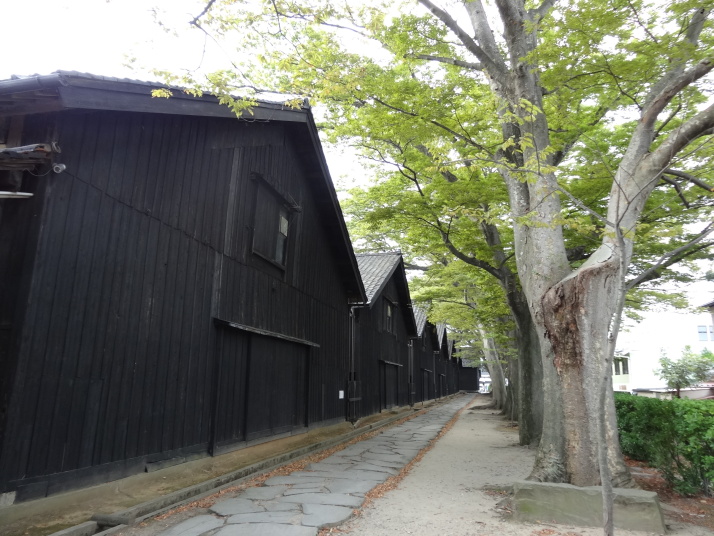 朝、酒田の街を山居倉庫まで散歩。山居倉庫は1893年築で酒田米穀取引所の付属倉庫として、舟の積み降ろしに便利な最上川と新井田川に挟まれた通称山居島(さんきょじま)に建てられた倉庫。ケヤキの並木と並列して建てられているのが特徴。これは、並木が風よけや日よけの役割をし、低温で保存することができるからだとか。現在もJAの倉庫として活躍中。