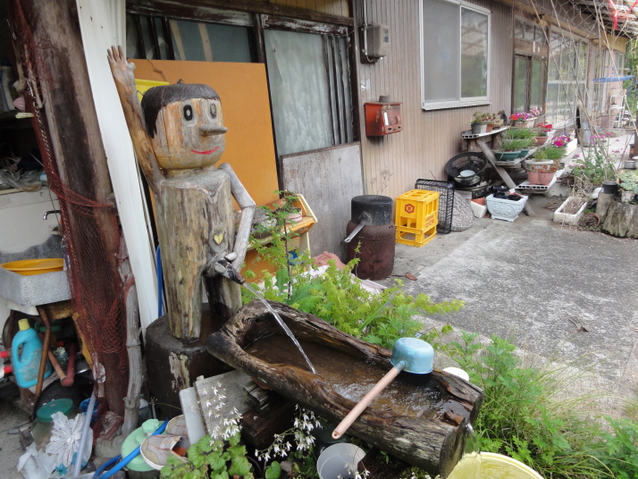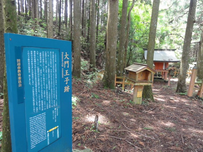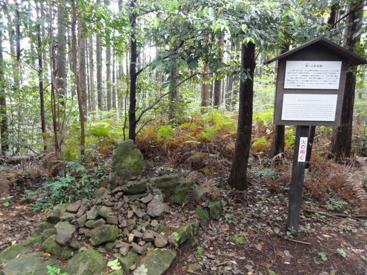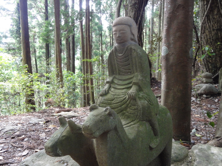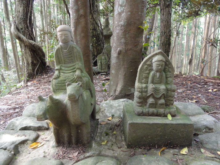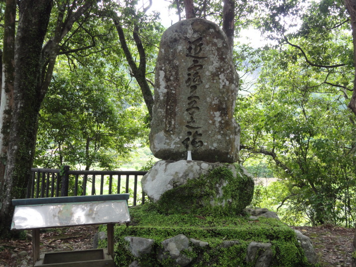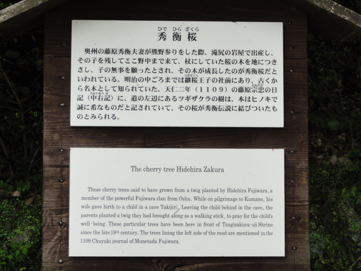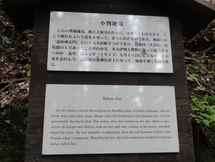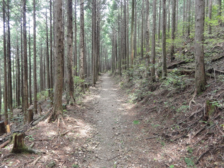 8時に田辺駅を出発、9時前に滝尻王子をスタートです。天気は晴れでちょっと安心。 ちょっと下って又、登ると飯盛山山頂(340.7m)の展望台に出ますが、大きな蜂がいて休憩が出来ません。針地蔵尊や夫婦地蔵を経て10時半に高原熊野神社に到着。高原霧の里休憩所や展望台があり、ここで暫く休憩です。旧旅籠通りの急な石畳を登ると山道に変わり、11時半に大門王子に着きました。ここから暫くは平坦な道が続きます。12時に十丈休憩所で昼食です、今日も田辺駅キオスクのお握り弁当。更に十丈王子を経て小判地蔵を過ぎ、最後の急な登りを行くと、今日の最高地点標高600mの上多和茶屋跡に到着しました。 13時30分に大坂本王子を通過し、14時に箸折峠(287m)の牛馬童子に着きました。「花山院が熊野詣の際この地で昼食をとった時、箸を忘れたことに気づいた随従の者が茅を折って花山院に渡した。花山院はその茅から血の様な赤い露がしたたり落ちるのを見て『これは血か、露か』と訊ねた。以来、熊野の山の人々はこの峠を箸折峠と呼び、はるか眼下に見える里を血か露(近露)と呼ぶようになった」とのこと。そして牛馬童子は花山院の旅姿とも言われています。14時20分に近露王子に到着。今日はここに泊まる予定にしていますが、早いのでもう少し先に進むことにしました。旅館の主にその旨を話すと、今日の終点で電話すれば迎えに行ってやると(ラッキー)。これで安心して進めます。 近露にある近野小学校の校庭は全面芝生。その前を通ってだらだらと坂を登っていくと、比曽原王子(455m)に到着、更に進んで15時35分に継桜王子(506m)に着きました。境内を護るように樹齢800年以上の杉の巨木群があります。野中の一方杉と呼ばれ、全ての枝が南の方角(那智山)を指しているというご神木です。その先に「とがの木茶屋」があり、更にその先には秀衡桜がありました。安部清明腰掛け石に座って中川王子を経て、16時半に小広王子(535m)に到着。本日はここまで、旅館の主に電話して迎えに来てもらいました。 今日の宿「月の家旅館」の客は、私と中辺路を歩いている夫婦連れの計3人。 |