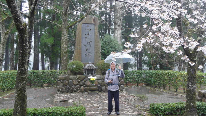先ず、本宮大社旧社地である大斎原(おおゆのはら)へ。高さ34mの日本一の大鳥居と桜が迎えてくれます。境内に一遍上人の南無阿弥陀仏の名号碑がありました。