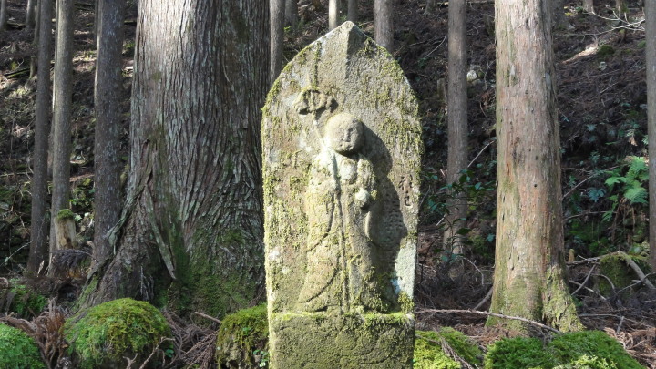 小口から大雲取越えで那智山まで歩き、青岸渡寺と熊野那智大社をお参りし、大門坂まで歩く16kmの旅です。 朝6時40分に出発、30分ほどすると円座石(わろうだいし)に着きます。熊野三山の神々がここで談笑したという御座所で、苔むした岩肌に熊野三山の本地仏が梵字で彫られています。(右:阿弥陀仏(本宮)、中:薬師仏(新宮)、左:観音仏(那智)). 8時過ぎに楠の久保旅籠跡を過ぎると大きな岩に南無観世音菩薩と彫ってありました。更に楠久保の地蔵が静かに佇んでいます。過酷な熊野詣の途中に志半ばで力尽きた人々の霊を供養した所で、他の場所にも地蔵菩薩がありました。最後の急坂の胴切坂を上って、9時45分に越前峠(840m)に到着。付近には卒業記念で大雲取越えをした小学校の記念板が立っています。 峠を越え急な下り坂を進んでいた10時半ごろ、那智方面から登ってくる人に遭遇。一人旅の老人でこれがビックリ。御年86才の千葉から来た方、滝尻から中辺路で本宮大社まで歩き、川下りで新宮に行き、更に歩いて那智大社を参拝して大雲取越え・小雲取越えで本宮大社に戻るという、平安時代の熊野詣の正規コース。トータル90kmを超すアップダウンの激しい道を連続して歩き通しているとんでもない老人です。「これが最後だから・・」と言って家を出てきたと笑っているが、顔の色艶、声が若々しい全く元気な人でした。 地蔵茶屋跡で昼食した後、また上りを暫く進んで13時過ぎに舟見峠(883m)に到着、遥か先には太平洋を望むことができました。 青岸渡寺三重塔と那智大滝の絶景を眺めてから、青岸渡寺(西国巡礼の一番札所)、熊野那智大社(主祭神は夫須美大神(イザナミノミコト))を参詣し、大門坂を下ったところで今日の旅は終了、バスで紀伊勝浦へ。 |