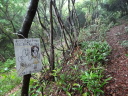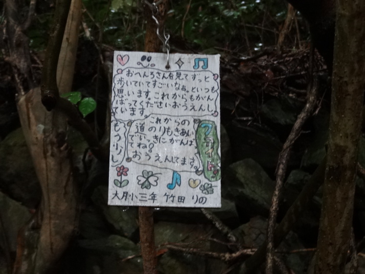 13時半ごろ叶埼灯台に着き、灯台の先の遊歩道を進み岬の先端へ。断崖絶壁の場所から雄大な太平洋を眺めました。この頃からポツポツと降り始め次第に雨は本降りに。そんな中15時ちょっと前に月山神社へ行く遍路道に入りました。この遍路道には地元の月山小学校の児童が作った激励の札が沢山掛けられています。これには本当に勇気付けられました。15時半に番外月山神社を参拝しました。 |