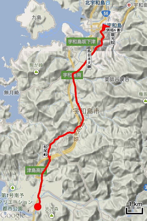 | 宿7:30→松尾峠9:10→馬目木大師11:10→別格6番龍光院11:40 →宇和島駅11:55 |