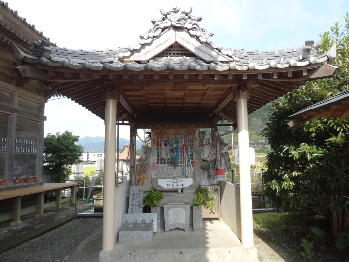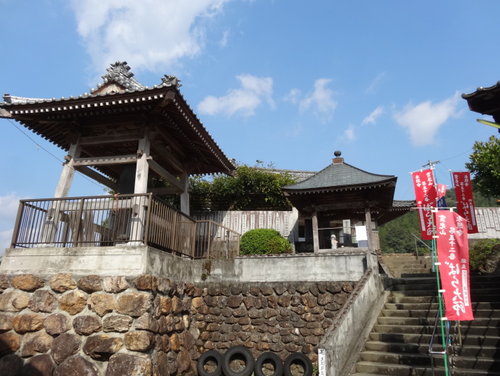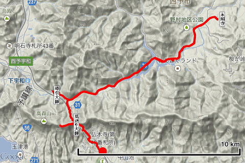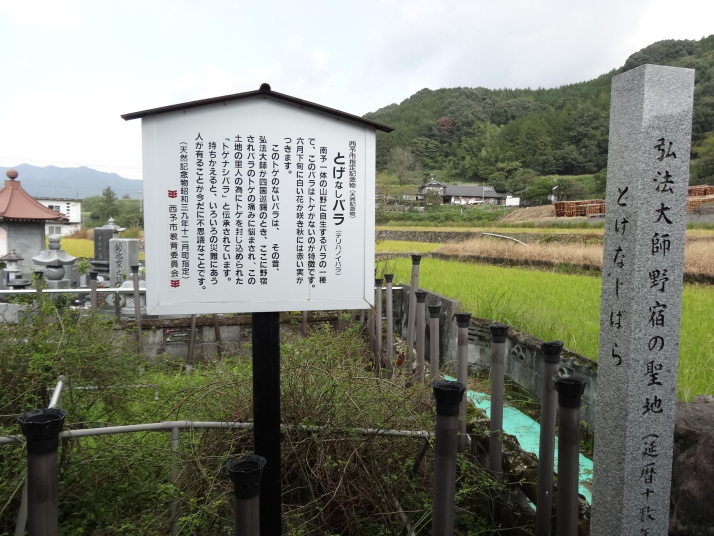 昨日の終点、佛木寺まで宿の車で送ってもらって6時40分にスタート。小雨が降る中、結構勾配のキツイ上りを進み7時50分に歯長峠480mに到着。番外見送り大師を参ったあと、道を間違え更に上に登ってしまいました。約30分ロスして元に戻り下りへ。この頃から雨も上がってきました。昼食で入った喫茶店で、地元のおじさんが松茸を取ったと来店。ザックを開けてビックリ、約1kgはあるという形の良い松茸がドッサリ、卸値で5万円は下らないとのこと。ある所にはあるものですね。 番外永照寺は別名バラ大師と呼ばれています。弘法大師がこの地で野宿をした時、群生するバラの棘で安眠できず、一夜が十日の苦行に感じられた。村人も困っているだろうとバラの棘を封じ込め、棘なしバラにしたとの伝承があります。ただ、このバラを他の土地に持っていくと棘が出ていろいろな災難にあうとも。 16時に番外導引大師を打って近くの民宿へ。ここでもらったみかんが甘くて旨かったので、民宿のおばさんにみかん農家を紹介してもらって自宅にも送りました。 |