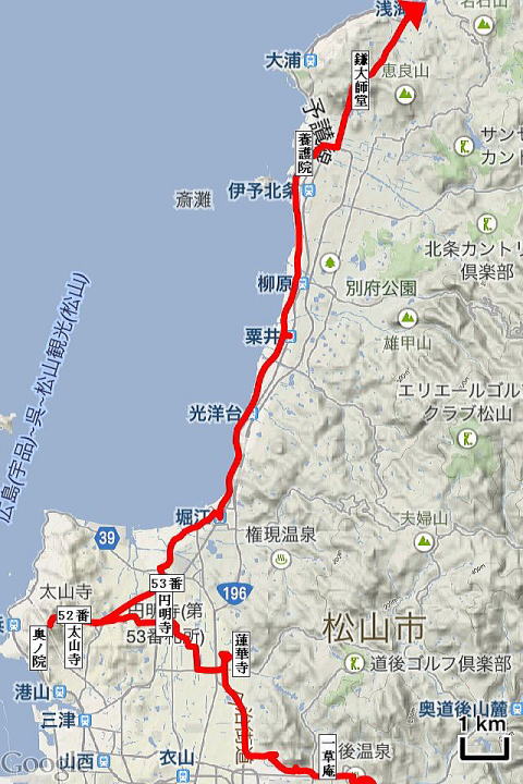 | 宿7:15→山頭火一草庵7:45→蓮華寺9:00→52番太山寺10:25→奥ノ院11:15→53番円明寺12:15→養護院15:30→鎌大師堂16:00→JR浅海駅16:35→宿17:00 |