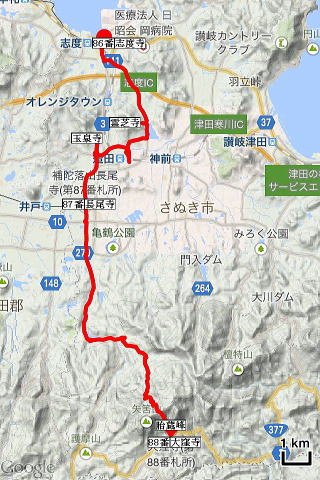 宿7:10→86番志度寺7:20→霊芝寺9:05→玉泉寺10:20→87番長尾寺11:15→胎蔵峰16:40→88番大窪寺16:58→宿17:30 |